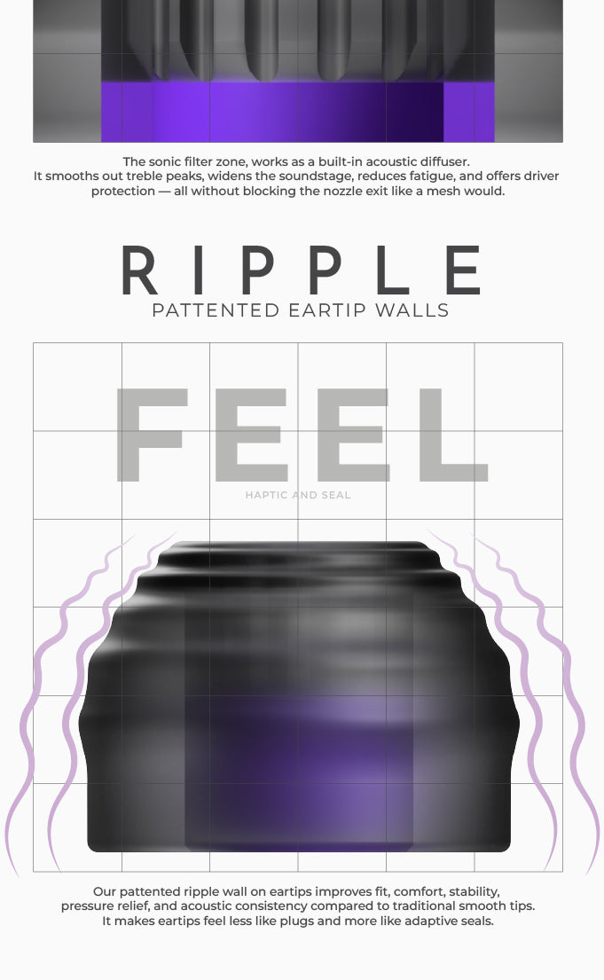 The Sonic Filtering Zone functions like a built-in acoustic amplifier. It smooths high-frequency peaks, widens the soundstage, reduces listening fatigue, and protects the drivers. It also doesn't block the sound outlet like a mesh filter.